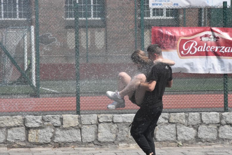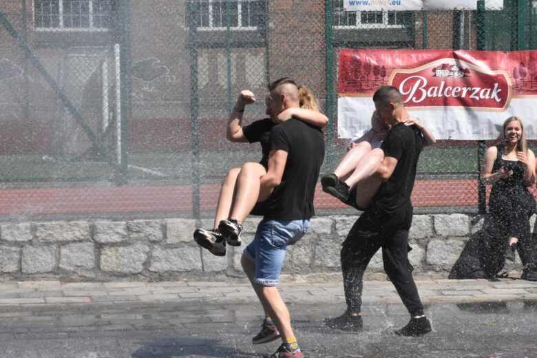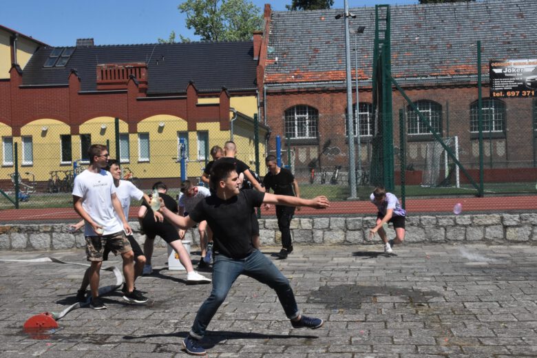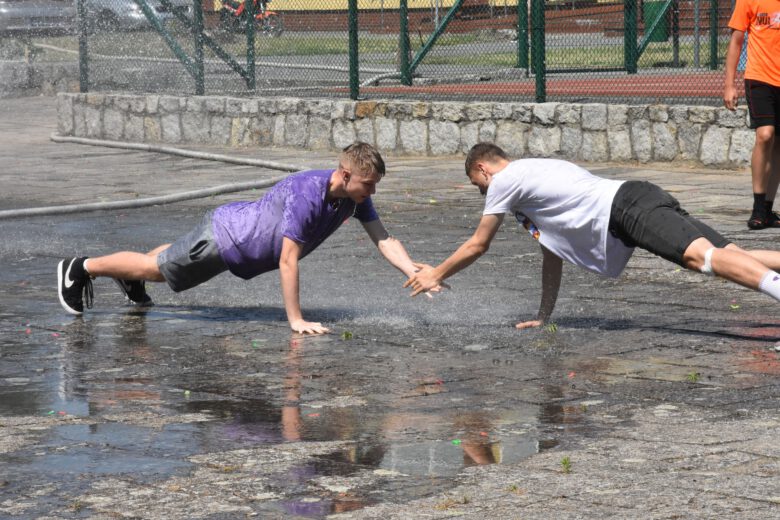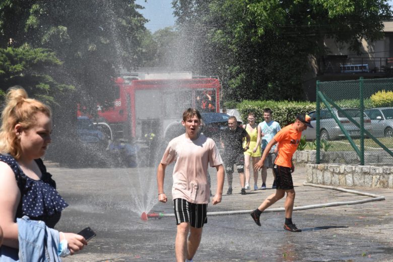 Dla ochłody w ten upalny dzień strażacy uruchomili kurtynę wodną, a uczestnicy przystąpili do bitwy na balony z wodą.