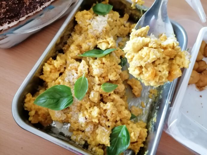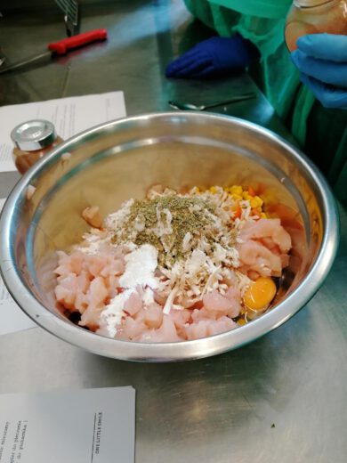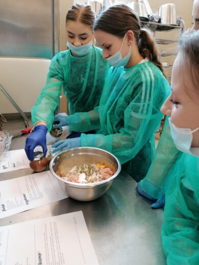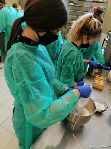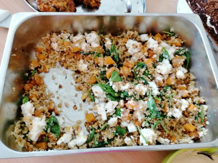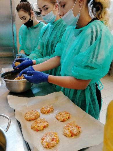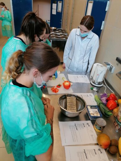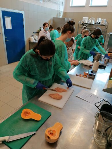 Kolejnym etapem były warsztaty praktyczne z organizacji miejsc pracy i utrzymania higieny a także przygotowanie dań zgodnie z filozofią Slow Food. Uczniowie przygotowali kotleciki z kurczaka i warzyw, pieczone warzywa z humusem, risotto dyniowe z kurczakiem, deser Tiramisu, sałatkę z kaszą bulgur i pieczoną dynią oraz przepyszne smoothie owocowo-warzywne.