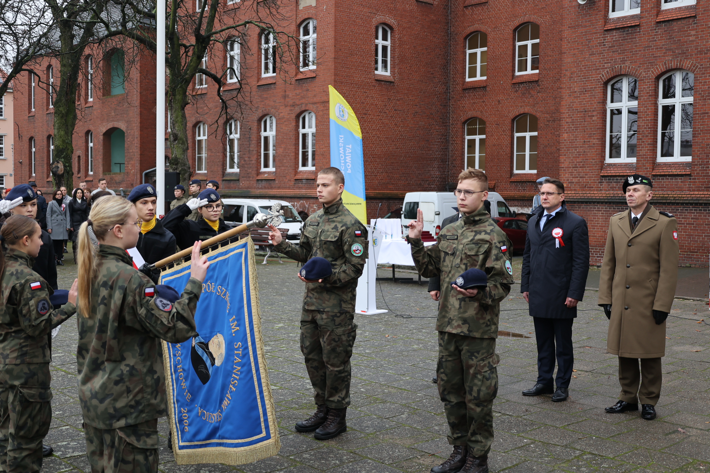 Po części artystycznej odbyła się uroczystość ślubowania kadetów Oddziału Przygotowania Wojskowego uczniów klasy pierwszej. W obecności społeczności szkolnej i zaproszonych gości młodzi kadeci złożyli przysięgę na sztandar szkoły, zobowiązując się do nauki, dyscypliny i służby dla Ojczyzny.